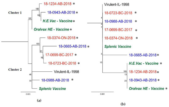 In the present study, whole genome phylogenetic analysis shows the separation of seven whole genome field sequences into two clusters: (1) the first (Cluster 1) considering vaccine and vaccine-like strains (99.82–99.96% nt similarity), and (2) Cluster 2 (99.71–99.98%), including virulent and suspected-virulent strains together with the splenic vaccine, which is not commercially available in Canada. Similarly, as with previous publications, all major ORFs were located as expected [2,40]. As in previous research [6,40,41], no major changes in either of the genes analyzed were discovered, only single point mutations that may influence the virus ability to cause disease [6,40,41].