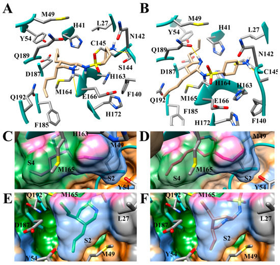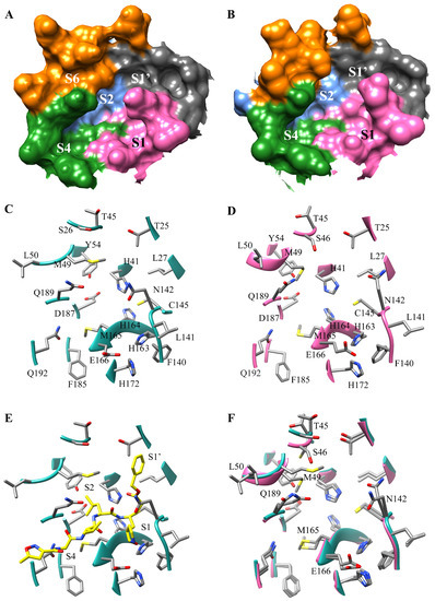 Coronaviruses typically have several binding pockets within their protease which makes up the active site. Based on the crystal structure SARS-CoV-2 Mpro (PDB ID 6LU7) four binding pockets, S1, S1′, S2, and S4, are present [10]. The side chains of residues Phe-140, Asn-142, Ser-144, Cys145, His-163, His-172, and Glu-166, and the backbone of Leu-141, Gly-143, His-164, and Met-165 create the S1 binding site (Figure 1). The S1′ site is created by the side chains of His-41, Val 42, Asn-119, Thr-25, Cys-145, Gly-143, and the backbone of Thr-26. Subsite S2 is formed by the side chains of Tyr-54, Asp-187, Met-49, and His-41, and the backbone of Arg-188. The last subsite S4 is created by the side chains of Met-165, Leu-167, Pro-168, Ala-191, Gln-192, and the backbones of residues Glu-166, Arg-188, Thr-190. The surfaces and ribbon structure of the actives site for SARS-CoV-2 Mpro 6LU7 and 5R7Z crystal structures are shown in Figure 1A–E.