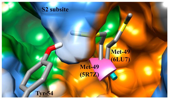 Proteins are flexible; thus, the shape of the active site can change as they move. Proteins can be crystallized in multiple conformations resulting in variations of the side-chain orientations in the residues located in a protein’s active site. A comparison of the crystal structures for SARS-CoV-2 Mpro 6LU7 and 5R7Z was performed to determine structural variations that could contribute to differences in binding poses. When overlaying 6LU7 and 5R7Z, the crystal structure’s residues Thr-45, Ser-46, Met-49, Leu-50, Asn-142, Met-165, Glu-166, and Gln-189 were observed to have side chains in different orientations (Figure 1F). The most significant variation to the active site can be seen when comparing Met-49. The change in orientation decreases the length of the S2 subsite by at least 3.1 Å. When the side chain of Met-49 is up, as seen in 6LU7, then the S2 active site extends all the way to the hydroxyl group of Tyr-54. When the Met-49 side chain is down then the Tyr-54 becomes buried (Figure 2). A second variation that can be seen when comparing these two receptors is the cleft on the surface that is created behind the S2 pocket in 6LU7, which is significantly smaller in 5R7Z (Figure 1A,B). This cleft represents another accessible site for binding. These observations taken together demonstrate the need for researchers to consider the impact of the multiple conformations on the S2 pocket and binding cleft. The use of multiple conformations when using docking will assist in the prediction of new antivirals agents targeting SARS-CoV-2 Mpro as the diversity of accessible variations can produce distinct binding poses for an inhibitor compound. Compounds not docked in multiple receptors may produce false negatives if not considered through a holistic methodology. As we will show in this study, the conformation of Met-49 can contribute to drastic differences in binding poses and affinity.
