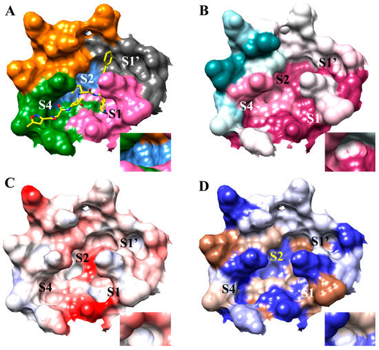 Analysis of binding subsites of SARS-CoV-2 active site using PDB 6LU7: The larger image is the overall active site. The S2 subsite is shown in the smaller image in each panel. This orientation shows the characteristics of inside of the S2 subsite that cannot be seen in the larger image. (A) Subsites S1, S1′, S2, and S4. N3 inhibitor is shown for orientation; (B) Conservation of subsites. Pink and magenta represent regions that are more conserved, dark cyan and light cyan represent regions that are less conserved. White represents regions without a high or low degree of conservation. (C) Electrostatic potential map of subsites. Red represents areas of negative charge density, while blue represents regions of positive charge density. White represents neutral regions. The darker the red or the blue, the greater the degree of negative or positive charge density. (D) Hydrophobicity plot of each subsite. The sienna-colored areas represent regions of hydrophobic character. The blue regions represent areas of hydrophilic character. The darker shades of sienna or blue represent greater hydrophobic or hydrophilic character.