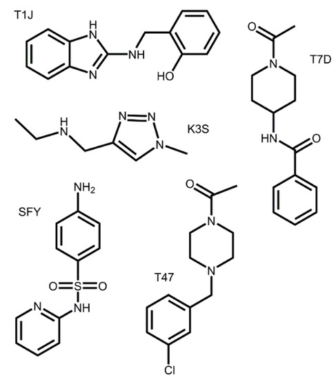 Due to the variation, both receptors were used to evaluate the docking of all compounds. The highest binding score was accepted as the preferred mode of binding and further analyzed. The docking scores for the zinc database inhibitors that were successfully docked are listed in Supplementary Table S1. Five of the docked zinc database inhibitors, T1J, SFY, T47, K3S, and T7D (Figure 4 and Table 2), produced docking scores of 5.92, 5.42, 4.69, 3.80, and 3.47, respectively. These inhibitors were selected as templates to investigate the impact of structural variations of inhibitor compounds on the SARS-CoV-2 Mpro receptor. In the crystal structures containing T1J, SFY and K3S are shown to bind to an allosteric site. The compounds T47 and T7D are shown to be covalently bound to the active site serine in their crystal structures. For the purposes of evaluating binding preferences in SARS-CoV-2 Mpro, all compounds were docked into the active site of SARS-CoV-2 Mpro and used as template reference structures.