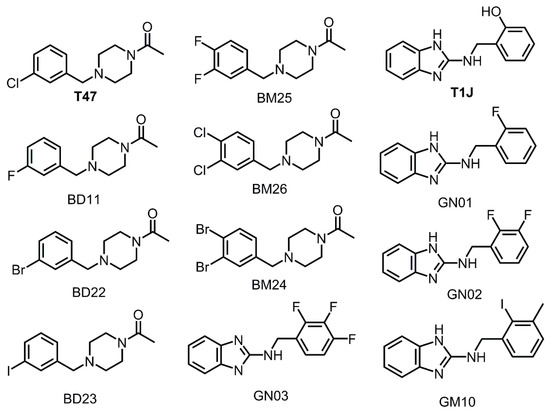 Structures of T47and T1J compound derivatives designed for the halogen dataset.