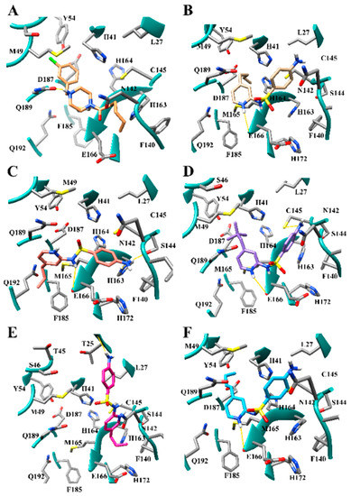 Modes of binding for (A) HS04 (sandy); (B) SD11 (tan); (C) SD12 (salmon); (D) SD15 (plum); (E) SD23 (deep pink); (F) and SD27 (blue) compounds designed for aliphatic substituent dataset in PDB 6LU7. Hydrogen bonding is indicated by solid yellow lines.