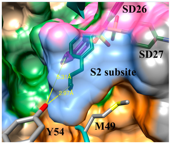 The optimal bond angles are important to note as the angling of the ortho-substituted compounds typically did not produce gains in binding affinity that were as significant as the meta- or para-substituted compounds. The para orientation promoted binding to compounds to the active site in a linear conformation, while the meta substitution pattern promotes binding to S2 and S1 subsites efficiently. The ortho conformation decreased the ability of these compounds to access the S2 subsite with the alkyl groups, resulting in weaker binding affinities compared to the meta- and para-derivative compounds. This decrease in S2 subsite access can be explained in terms of the depth of penetration of the alkyl substituent into the S2 subsite. Distances were measured from the Tyr-54 oxygen atom and the methyl group of the butenyl substituent of compounds SD27 and SD26. When comparing differences in depth of penetration into the S2 subsite, the meta-substituted SD27 is 2.97 Å from Tyr-54 while the ortho-substituted SD26 is a distance of 5.31 Å from Tyr-54 (Figure 8). This is a difference of 3.22 Å in depth of penetration into the S2 subsite, increasing SD27′s binding affinity of 7.04 −log10(Kd) over SD26′s binding affinity of 6.10 −log10(Kd) by almost one order of magnitude. Thus alkyl substituents in the S2 subsite improve binding affinity the most when they penetrate deep into the S2 subsite. The N3 inhibitor which has a leucine residue that sits in the S2 subsite [9] is at a distance of 4.11 Å from the Tyr-54 (measured in the 6LU7 PDB crystal structure). Thus, this inhibitor could be further optimized if the residue was changed to a hydrophobic substituent which could penetrate deeper into the S2 subsite. While the angling of the ortho-substituted compounds decreases the ability of these compounds to access the S2 subsite with the alkyl groups, if these compounds are able to participate in π-π stacking interactions with His-41 they can be successfully directed into the S2 subsite which can serve to direct the alkyl groups into the S2 subsite.