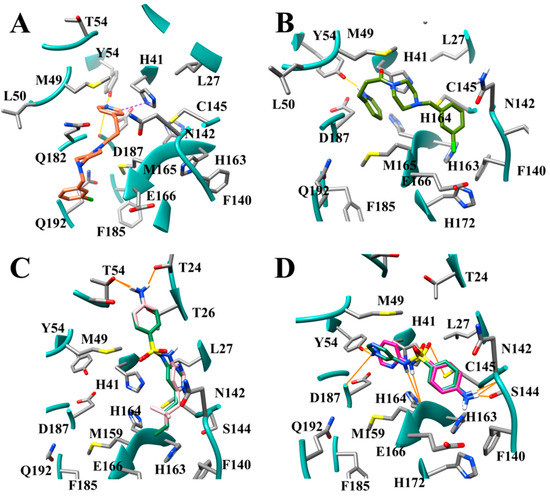 All compounds were docked into both the 5R7Z and 6LU7 SARS-CoV-2 Mpro crystal structures. Binding affinity for all compounds was predicted using the Surflex-Dock Geom (SFXC) protocol for all docking simulations. The Surflex-Dock Geom protocol default parameters were used for all docking runs. Briefly, parameters were set to start docking with an additional four starting conformations to enable 100 rotatable bonds and 20 poses max and minimize compounds both pre-dock and post-docking. The binding affinities were calculated using the C-scoring method in Sybyl-X and are reported as −log10(Kd) values. The empirical scoring function used accounts for hydrophobic contact, polar interactions, and entropic fixation cost in translational, torsional, and rotational degrees of freedom [31,32]. Docking scores are outputted in −log10(Kd) values. Thus, a docking score of 7 correlates to a binding affinity of 1 × 10−7 M. A larger binding score indicates a stronger binding to the protein receptor. Docking poses were visualized in both Sybyl-X and UCSF Chimera programs. Molecular interactions were also evaluated in both programs. All images were produced in UCSF Chimera.