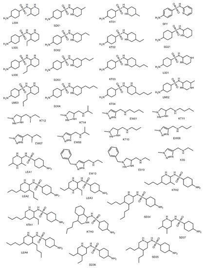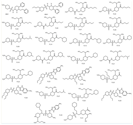 To determine the overall effectiveness of the guidelines developed in this study, a new dataset was created with twenty-six optimized compounds and given the name Foundations-Lab (FL) compounds series (Figure 15). These compounds were designed and successfully docked into the SARS-CoV-2 receptors. Because the conformational flexibility of the compounds was outside of the Sybyl-X program capabilities, “generate favored Tautomers/Stereoisomers” selection was used for ligand preparation. Five compounds (FL23, FL24, FL26, FL29, and FL30) had molecular weights (MWs) ranging from 519 to 605 Da, which is over the 500 MW cutoff used for Lipinksi’s rules. Thus, for the purposes of evaluating the effectiveness of the rules, the drug-like setting was not used to prepare the compounds in the final hybrid dataset. The docking scores of the FL compounds are listed in Table 8.