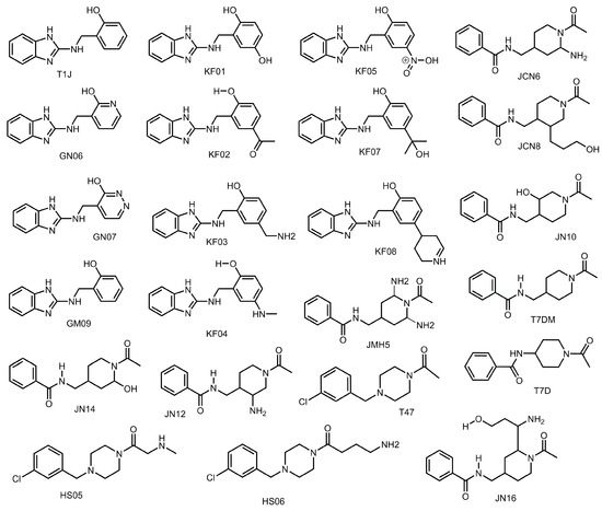 Structures of T7D and T1J compound derivatives designed for hydrogen bonding dataset.