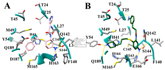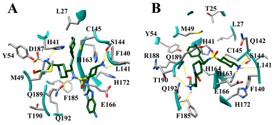 Mode of binding of the top two optimized compounds (A) FL30 (green); and (B) FL20 (green) designed using molecular guidelines discovered to maximize binding to the SARS-CoV-2 Mpro active site.