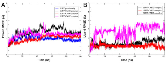 Root mean square deviation (RMSD) analysis of molecular dynamic (MD) simulation trajectory. The RMSD plot obtained for (A) C-α atoms of the protein SARS-CoV-2 Mpro (PDB ID 6LU7) with CM02, CM06 and CM07 complex; and (B) ligand-heavy atoms for CM02, CM06 and CM07-SARS-CoV-2 Mpro complex (PDB ID: 6LU7), with respect to the reference frame at time 0 ns.