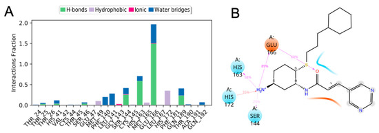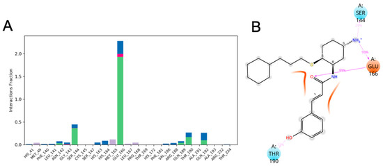 Analysis of (A) molecular interactions; and (B) type of contacts (2D interaction contour map with the key protein residues) for CM06 with SARS-CoV-2 Mpro (PDB ID: 6LU7) after MD simulation. Interactions that lasted more than 10% of the simulation time were considered.