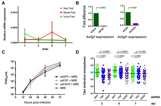 However, when Aefgf or Aefgfr were silenced by injection of dsRNA in mosquitoes, titers of orally acquired 5’dsMRE16ic were significantly reduced at both 3 and 5 dpi compared to mosquitoes injected with control gfp dsRNA (Figure 1D). We were not able to formally demonstrate knockdown of Aefgf or Aefgfr by measuring transcript levels in whole mosquitoes, due to a high degree of variability between injected mosquitoes. However, the effects of silencing either Aefgf or Aefgfr were very similar, as would be predicted since the encoded proteins act in the same pathway. This lends confidence to the effect on virus titer being due to the reduction of expression of these genes by the dsRNA treatment. Silencing Aefgf or Aefgfr did not have a significant effect on SINV titers at 7 dpi, perhaps due to either renewed AeFGF and AeFGFR expression (transient gene silencing) or the virus overcoming its dependence on FGF signaling by this time. No effects on mosquito viability were observed following injection of any of the dsRNAs.