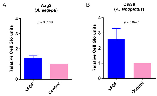 The cell transmigration experiment was performed as previously described [4] using Costar transwells with polycarbonate membrane inserts. Approximately 1 × 105 Aag2 or C6/36 cells were seeded onto 3 µM pore-size transwell inserts. Partially purified vFGF or control proteins were added to 24-well plates containing phosphate buffered saline. The transwell inserts were transferred to 24-well plates containing heparin-purified proteins and incubated at 27 °C for 4 h before removal. Cells that had migrated into the wells were quantified using CellTiter-Glo luminescent substrate (Promega, Madison, WI, USA), according to the provided protocol.