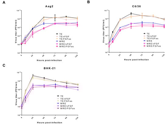 Effect of vFGF expression on SINV replication in cultured cells. Aag2 (A), C6/36 (B) and BHK-21 (C) cells were infected with the indicated viruses at an MOI of 0.001 PFU/cell. Supernatants from infected cells were collected at the times shown to determine virus production by TCID50 assays. The bars indicate the means ± standard error of three independent experiments. Results were analyzed by two-way ANOVA for Aag2 (TE viruses, p = 0.73; MRE viruses, p = 0.037), C6/36 (TE viruses, p = 0.56; MRE viruses, p = 0.13), and BHK-21 (TE viruses, p = 0.84; MRE viruses, p = 0.54).