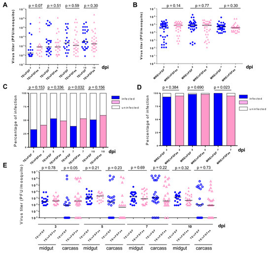 To determine if vFGF had any effects on the levels of SINV replication in mosquitoes, titers from individual TE/vFGF-infected mosquitoes were compared to those infected with the antisense control virus TE/vFGFas. We also compared infection by MRE/vFGF and MRE/vFGFas in these experiments. No effects on mosquito viability were observed following infection with any of the viruses during the time frame of the experiment. Virus titers and infection prevalence (as determined by detectable virus titer) were similar between mosquitoes infected with TE/vFGF and TE/vFGFas (Figure 7A,C) or between MRE/vFGF and MRE/vFGFas (Figure 7B,D). Although at 7 dpi there were significant prevalence differences between vFGF- and vFGFas-containing viruses, these did not have a consistent pattern. In order to determine if expression of vFGF during SINV infection had any advantage in promoting virus escape from the midgut, SINV-infected mosquitoes were dissected and individual midguts and carcasses (the rest of the mosquito excluding the midgut) of the mosquitoes were titered separately. vFGF expression did not appear to affect SINV dissemination from the midgut, as neither midgut nor carcass titers were significantly different between the two viruses at any of the time points examined, with the possible exception of 3 dpi carcass (Figure 7E).