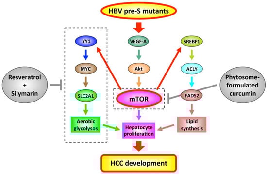 Schematic representation of HBV pre-S mutants-activated mTOR signal pathways as potential targets for HCC chemoprevention. In chronic HBV infection, pre-S mutants can upregulate the expression of vascular endothelial growth factor-A (VEGF-A) in GHHs. Through binding to its cognate receptor, the upregulated VEGF-A functions in either autocrine or paracrine manners to activate mTOR via mediation of Akt activation. The activated mTOR can promote hepatocyte proliferation directly or indirectly, by initiating two metabolic pathways, one involving Yin Yang 1 (YY1)/MYC/solute carrier family 2 (facilitated glucose transporter) member 1 (SLC2A1) to induce aerobic glycolysis, and another involving sterol regulatory element-binding factor 1 (SREBF1)/adenosine triphosphate citrate lyase (ACLY)/fatty acid desaturase 2 (FADS2) to stimulate lipid synthesis. Combined effects of hepatocyte proliferation, aerobic glycolysis, and lipid synthesis will potentially result in HCC development. By means of blocking the pre-S mutants-activated mTOR signal pathways, treatment of either the resveratrol combined with silymarin or the phytosome-formulated curcumin exhibits potential efficacy in preventing HCC development. Abbreviations: HBV, hepatitis B virus; VEGF-A, vascular endothelial growth factor-A; mTOR, mammalian target of rapamycin; YY1, Yin Yang 1; SLC2A1, solute carrier family 2 (facilitated glucose transporter) member 1; SREBF1, sterol regulatory element-binding factor 1; ACLY, adenosine triphosphate citrate lyase; FADS2, fatty acid desaturase 2; HCC, hepatocellular carcinoma.