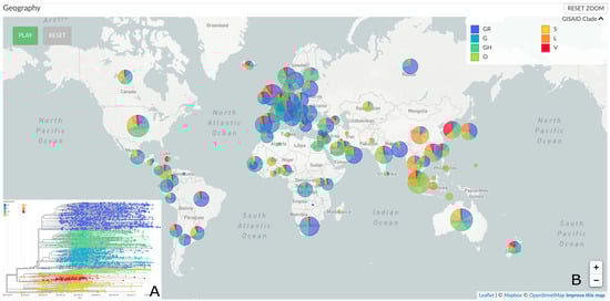 (A) Global phylogenetic analysis of SARS-CoV-2. The time-scaled tree was generated by the Nextstrain open source project showing genetic divergence of 4311 SARS-CoV-2 genomes submitted between December 2019 and August 2020 (accessed 11 August 2020). (B) Global distribution of the different SARS-CoV-2 clades defined by GISAID (i.e., GR, G, GH, O, S, L, and V).