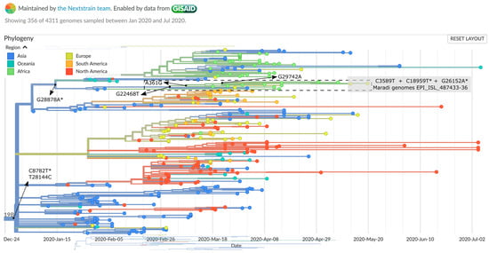 The rare silent mutation A361G, present in all four Maradi genomes, was recently observed in Benin, Nigeria, and Mali (Table 4), three neighboring countries of Niger, and places our genomes in a cluster of recent African descent (92% confidence), with its most recent common ancestor (MRCA) estimated between 28 February and 15 March 2020 (Figure 3). This is compatible with the suspected first COVID-19 case in Niger (reported on 19 March 2020), who had travelled to Togo, Ghana, Ivory Coast, and Burkina Faso []. The dates on which the first confirmed COVID-19 cases were reported in these countries, according to ECDC, were 7 (1 case), 13 (2 cases), 12 (1 case), and 11 March 2020 (2 cases), respectively.