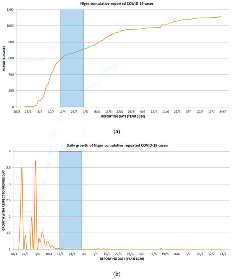 The first case of COVID-19 in Belgium was confirmed on 3 February 2020 []. On 19 March, the first case of COVID-19 in Niger was reported in the Nigerien capital, Niamey: a 36-year-old Nigerien or Nigerien national (depending on the report), a storekeeper in a land transport company, who had travelled along the Lomé (Togo)–Accra (Ghana)–Abidjan (Ivory Coast)–Ouagadougou (Burkina Faso) axis []. After that, two other COVID-19 cases were confirmed in Niamey: a Brazilian woman, who returned to Niger on 16 March 2020, coming from Switzerland, and a 51-year-old Italian man, who returned to Niger on 28 February 2020, from his home country of Italy []. On 24 March, the first death from the new coronavirus in Niger was recorded: a 62-year-old male, Brazilian national, who entered Niger from Senegal on 27 February []. Niger declared a national state of emergency due to the COVID-19 pandemic on 27 March. Gatherings of more than 50 people were banned, places of worship closed, and obligatory epidemiological safety measures were instituted, including the wear of facemasks and social distancing in public places and public transport. On 2 April, the first two COVID-19 cases outside Niamey were confirmed in two residents of Maradi.
