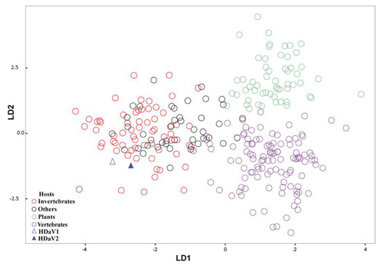 - Kapoor, A.; Simmonds, P.; Lipkin, W.I.; Zaidi, S.; Delwart, E. Use of nucleotide composition analysis to infer hosts for three novel picorna-like viruses. J. Virol. 2010, 84, 10322–10328. [Google Scholar] [CrossRef] [PubMed]