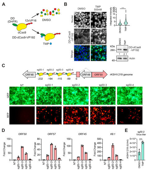 We set out to investigate whether a repurposed dCas9 fused to transcription activators can be guided to the KSHV genome to induce the expression of ORF50 and thereby trigger the complete KSHV lytic replication cycle. For this, we first generated a HEK293 cell line stably expressing a conditionally stabilized form of the dCas9-activator, DD-dCas9-VP192. The VP192 domain consists of 12 copies of the HSV-1 VP16 activator and the destabilizing domain (DD) is derived from the E. coli DHFR protein [32]. This engineered form of DHFR is highly unstable and can be stabilized by trimethoprim (TMP) (schematics in Figure 1A). DD-dCas9-VP192 has been previously used to induce the expression of multiple genes simultaneously to control cell differentiation [21,22]. HEK293 cells, expressing DD-dCas9-VP192, were then stably infected with rKSHV.219, a double-reporter recombinant KSHV virus (rKSHV.219). This virus expresses EGFP from a cellular constitutive promoter (EF1α) and RFP from the PAN viral lytic promoter that is under the control of ORF50 [26]. As a result, EGFP is expressed in all infected cells while RFP is expressed only in cells where the virus is undergoing lytic replication. In the generated cell line, we found that in the absence of TMP, DD-dCas9-VP192 (HA tagged) was localized in both the nucleus and cytoplasm, whereas upon addition of TMP, the stable protein accumulated predominantly in the nucleus. Stabilization and accumulation of the DD-dCas9-VP192 by TMP was confirmed also by immunoblot analysis (Figure 1B).