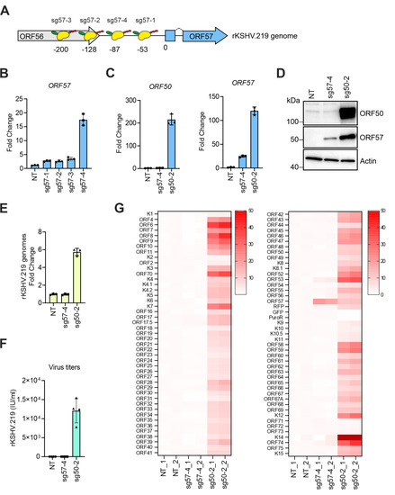 Activators fused to dCas9 can trigger the expression of ORF57 without disrupting the viral latency. (A) A schematic representation of DD-dCas9-VP192 binding sites upstream of the ORF57gene upon expression of the indicated sgRNAs. Numbers indicate nucleotides upstream of ORF57 start codon (ATG), shown as 0. (B–G) HEK293_DD-dCas9-VP192_rKSHV.219 cells were transfected with vectors expressing the indicated sgRNA or left non-transfected (NT) and treated with TMP (500 nM) for 72 h. (B) Analysis of ORF57 mRNA levels. (C) Analysis of ORF50 and ORF57 mRNA levels. (D) Immunoblot analysis for the indicated proteins. (E) Quantification of the intracellular KSHV genome copies. (F) Quantification of rKSHV.219 titers in the supernatant. (G) Heatmap of KSHV gene expression after RNA-seq analysis of samples in (C) (n = 2 biological replicates). The read counts were normalized to NT samples and to genome copy numbers calculated in (E). Dark red tiles show values above 50. (B,C,E,F) Each dot represents a biological replicate, bars show average, error bars show SD.