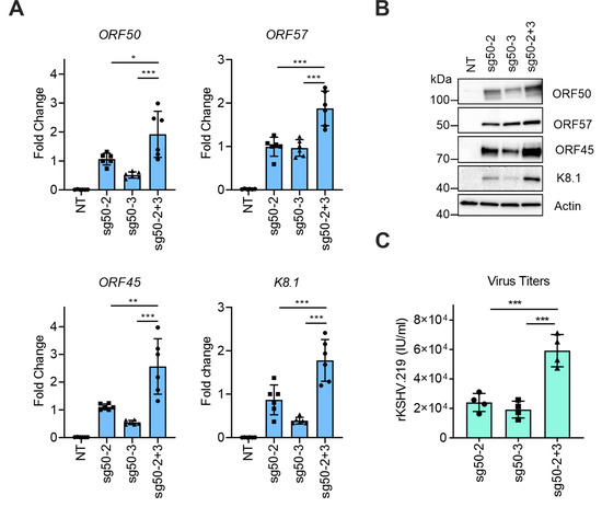 It has been shown that binding of the dCas9-activators to two different sites upstream of a cellular gene can further improve the target gene expression [21]. To test this in the context of the viral lytic gene expression, we compared KSHV reactivation in HEK293-DD-dCas9-VP192-rKSHV.219 cells that were transfected with sg50-2 and sg50-3 separately or as a 1:1 mixture of sg50-2 and sg50-3 (sg50-2+3); therefore, total amount of DNA transfected in all conditions (mixture vs. single) was equal. In comparison to sg50-2 or sg50-3 transfected cells, combination of both sgRNAs led to a significant increase in ORF50, ORF57, ORF45 and K8.1 expression at both mRNA and protein levels (Figure 3A,B). Next, we found that viral titers reflected the capacity of sg50-2 and sg50-3 to induce ORF50 expression. Expression of sg50-2 led to slightly higher virus titers than sg50-3, while combining sg50-2 and -3 (sg50-2+3) improved the viral titers significantly with an almost three-fold increase over the single sgRNAs (Figure 3C). This suggests that targeting DD-dCas9-VP192 at two sites upstream of the ORF50 gene improves the expression of the KSHV lytic proteins and virus production.