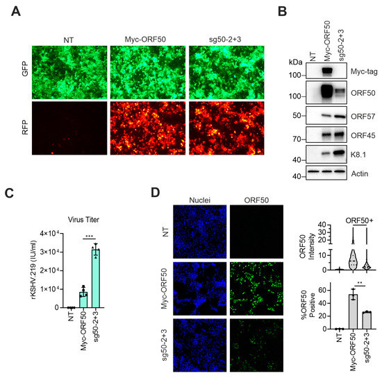 dCas9-activator is more efficient than ectopic expression of ORF50 to induce the viral lytic replication. (A–D) HEK293_DD-dCas9-VP192_rKSHV.219 cells were transfected with vectors expressing the sgRNA sg50-2 and sg50-3 (sg50-2+3) or Myc-ORF50 and treated with TMP (500 nM) for 72 h. (A) Representative images showing GFP (upper row) and RFP (lower row) expression of cells transfected with sg50-2 and sg50-3 (sg50-2+3), Myc-ORF50 or non-transfected (NT). RFP is a marker of the rKSHV.219 lytic replication cycle. (B) Immunoblot analysis for the indicated proteins. (C) Quantification of rKSHV.219 titers in the supernatant. (D) Quantification of ORF50 expression after staining of the cells with an anti-ORF50 antibody. Nuclei were counterstained with Hoechst 33342. (C,D) In the violin plot, n > 450 nuclei/condition. In the bar graphs, each dot represents a biological replicate, bars show average and error bars show SD. Student’s t test was used to calculate whether differences between Myc-ORF50 and sg50-2+3 groups were significant (** −p < 0.01, *** −p < 0.001).