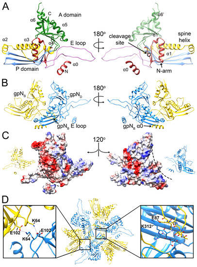The gpN capsid protein. (A) Ribbon diagram of gpNB (the most complete subunit), colored by structural feature: N-arm, red; E-loop, pink; P-domain β-sheet, blue; P-domain α-helices, yellow (α3 is the spine helix); A-domain, green. The right-hand panel is rotated by 180°. Key structural features are labeled, and the gpO cleavage site between residues 31 and 32 is indicated (circle). (B) Intra-capsomer interaction between the gpNB (yellow) and gpND (blue) subunits, showing how the gpNB E-loop overlays the spine helix of the neighboring (gpND) subunit. The right-hand panel is rotated by 180° and shows how the gpNB N-arm and α0 grasp the P-domain of gpND from underneath. (C) Electrostatic surfaces for the gpNB and gpND subunits from panel B, separated and rotated by 120° in opposite directions, as indicated by the insets. Interaction surfaces of opposite charge are indicated by the dashed lines. (D) Inter-capsomeric interaction between three gpND and their neighboring gpNB subunits related by the icosahedral threefold axis. The insets show details of the interactions between the gpND and gpNB subunits.