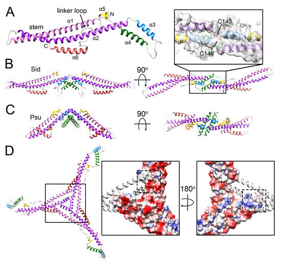 The Sid scaffold. (A) Ribbon diagram for one monomer of Sid. Relevant structural features are labeled. (B) Ribbon diagram of the Sid dimer, viewed from the side, perpendicular to the twofold axis (left) and from the top, looking down the twofold axis (right). Inset: detail of the twofold interaction that includes the disulfide bond (C140). The map is shown as a transparent gray isosurface. (C) The Psu dimer (PDB ID: 3RX6) [45], viewed perpendicular to (left) and down (right) the twofold axis. (D) Ribbon diagram of the Sid trimer, viewed down the icosahedral threefold axis. The insets on the right show details of the threefold interaction. Two Sid subunits are shown as electrostatic surfaces, with the third subunit as a ribbon diagram. The left panel shows the view from the outside of the capsid, while the right panel is viewed from the inside. The surfaces that interact are indicated by the dashed squares.