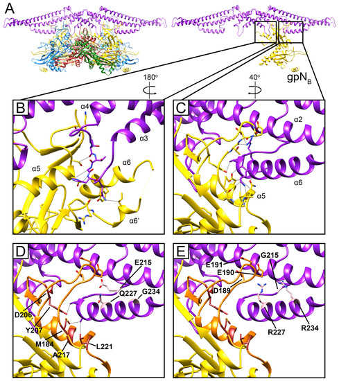 Sid-gpN interaction. (A) Ribbon diagram of the Sid dimer (purple) and the underlying gpN hexamer; subunits colored as in Figure 2. In the right panel, only gpNB is depicted. (B) Detail of the interaction between the Sid α3–α4 loop and gpNB. Residues that make contact are shown in stick representation, and contacts closer than 4 Å are shown as gray lines. (C) Interactions between the C-terminal helix α6 of Sid and the gpNB sir loop. (D) Same view as (C). The sir loop is shown in orange, and the residues mutated in sir and nms mutations are labeled in. (E) Same view as (D), showing how nms mutations (E215G, Q227R, G234R) might facilitate novel charged interactions with gpN (residues D189, E190, E191).