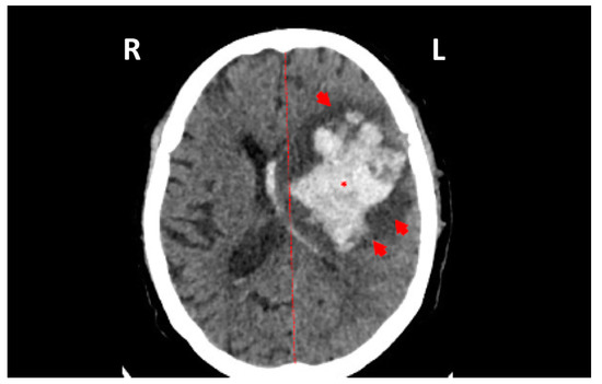 Computed tomography imaging of the patient’s brain showing an intraparenchymal hemorrhage (asterisk) surrounded by a brain edema (red arrows), as well as deviation from the cerebral middle line (red line).