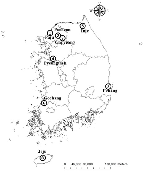 - Chong, S.T.; Kim, H.C.; Lee, I.-Y.; Kollars, T.M., Jr.; Sancho, A.R.; Sames, W.J.; Chae, J.-S.; Klein, T.A. Seasonal distribution of ticks in four habitats near the demilitarized zone, Gyeonggi-do (Province), Republic of Korea. Korean J. Parasitol. 2013, 51, 319–325. [Google Scholar] [CrossRef] [PubMed]
