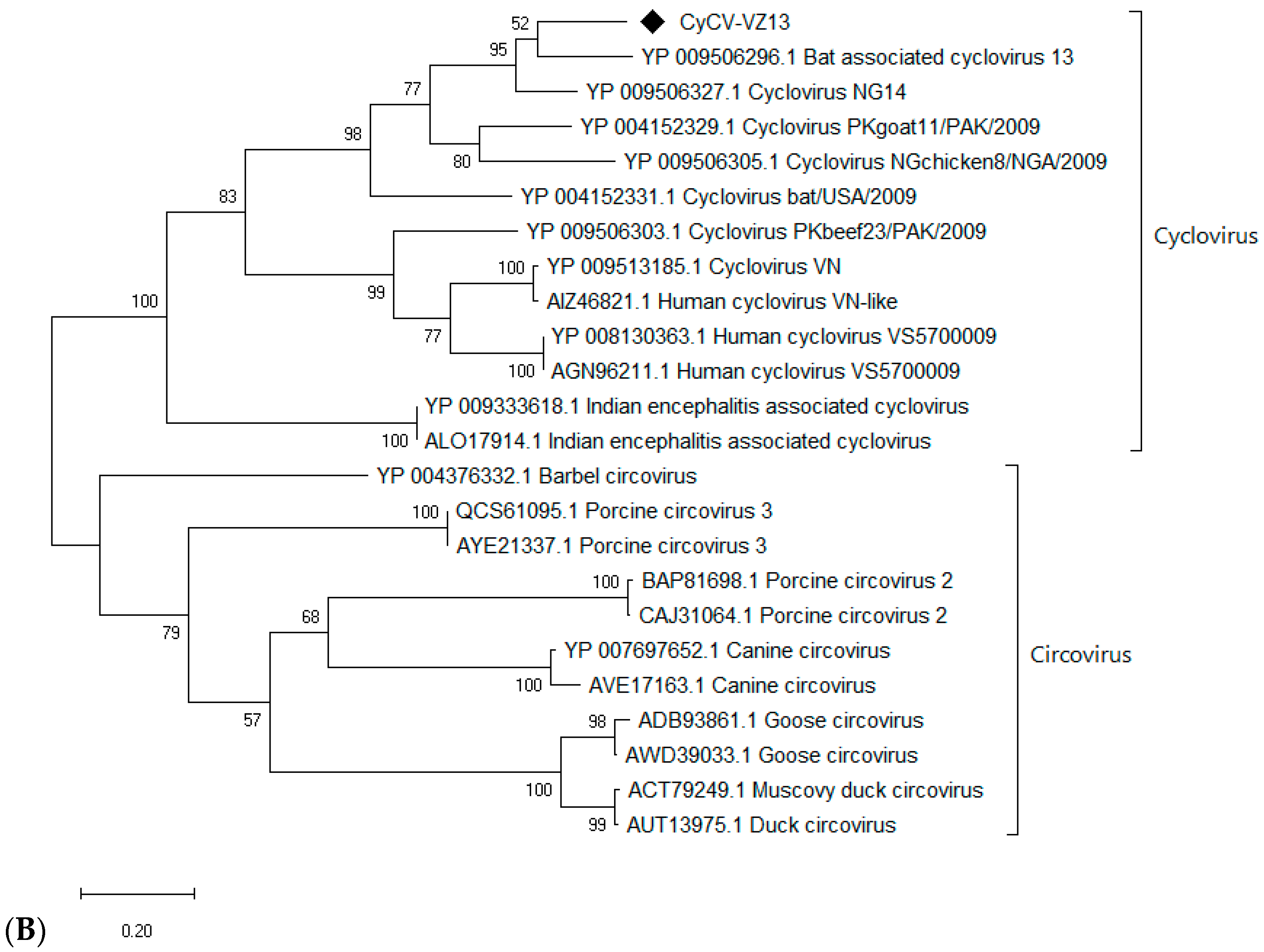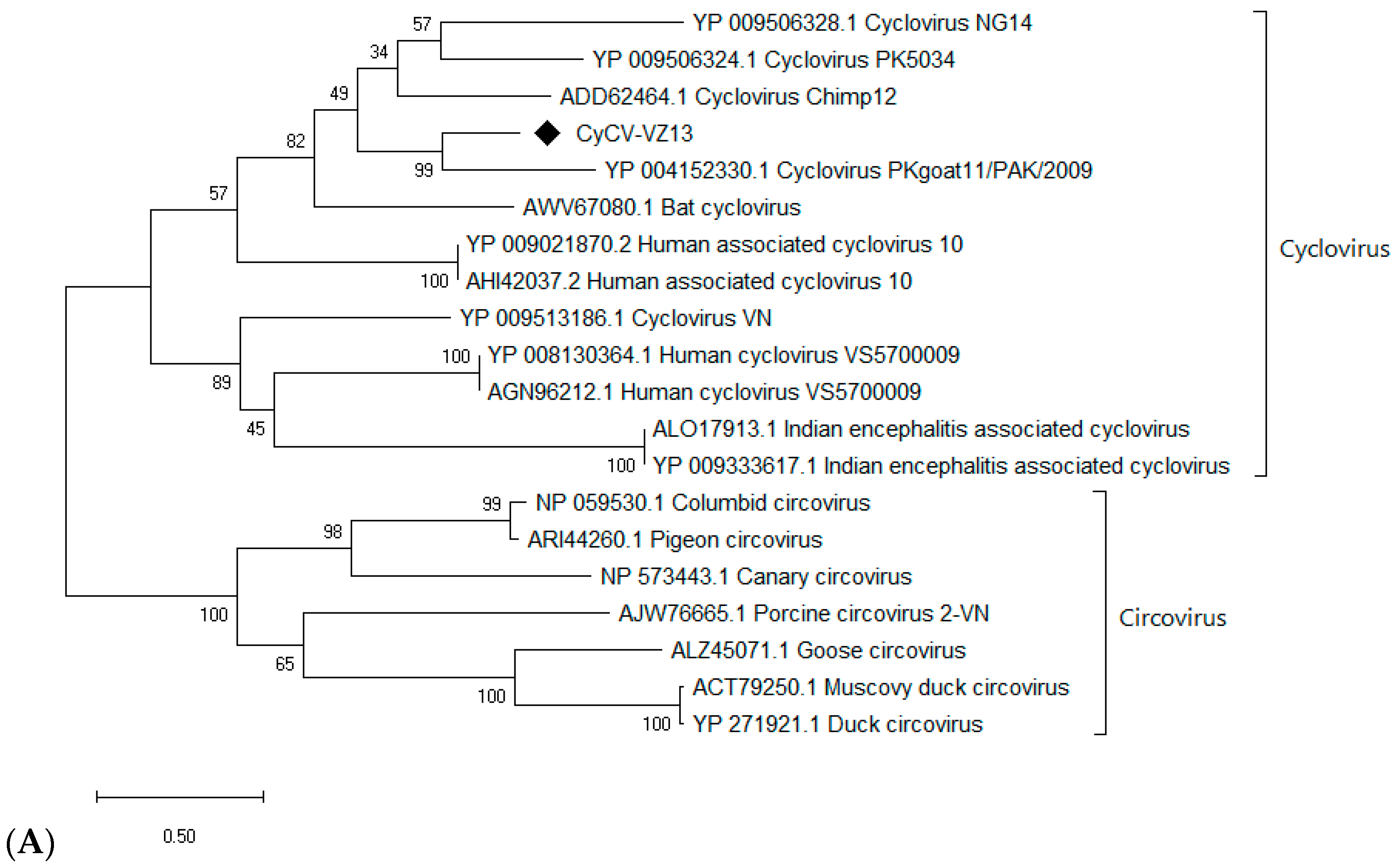 - Smits, S.L.; Zijlstra, E.E.; van Hellemond, J.J.; Schapendonk, C.M.E.; Bodewes, R.; Schürch, A.C.; Haagmans, B.L.; Osterhaus, A.D.M.E. Novel cyclovirus in human cerebrospinal fluid, Malawi, 2010-2011. Emerg Infect Dis. 2013, 19, 1511–1513. [Google Scholar] [CrossRef]