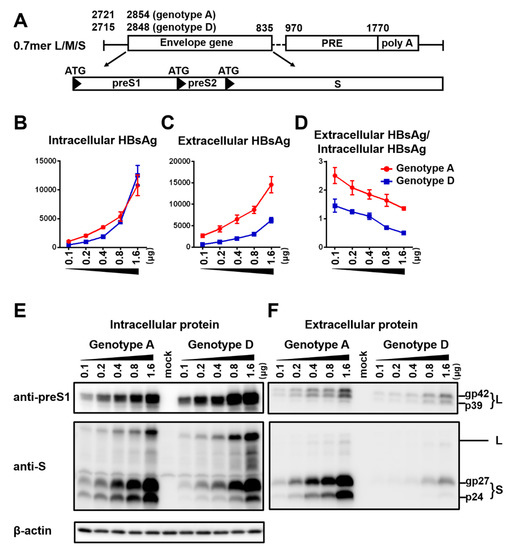 - Zhang, F.; Tang, X.L.; Garcia, T.; Lok, A.S.; Wang, Y.X.; Jia, H.D.; Qin, Y.L.; Chen, C.Y.; Wen, Y.M.; Li, J.S.; et al. Characterization of contrasting features between hepatitis B virus genotype A and genotype D in small envelope protein expression and surface antigen secretion. Virology 2017, 503, 52–61. [Google Scholar] [CrossRef] [PubMed]
