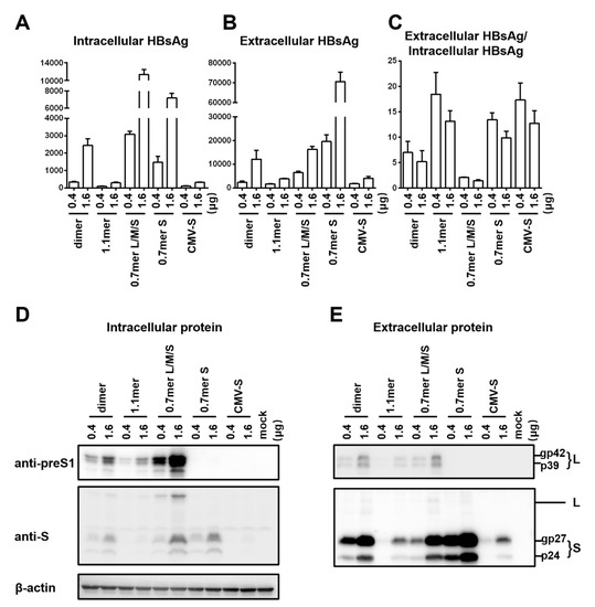 Surprisingly, the CMV-S construct produced much less S protein than the 0.7 mer S construct, as indicated by lower HBsAg titers in both cell lysate and culture supernatant (Figure 3A,B and Figure 4A,B). That did not increase the ratio of extracellular/intracellular HBsAg relative to 0.7 mer S construct (Figure 3C and Figure 4C). In this regard the CMV-S construct is highly artificial. It had only the 0.7 kb S gene (genomic positions 155–835) inserted to a mammalian expression vector. The 0.7 mer construct contained, besides the SPII promoter, two HBV enhancer elements and post-transcriptional regulatory element (PRE) for export of unspliced HBV RNAs [25,26], followed by SV40 polyA signal.