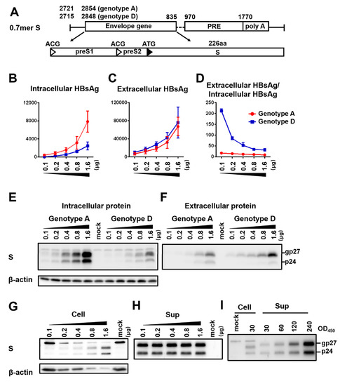 Impact of DNA dosage and viral genotype on S protein expression and HBsAg secretion from 0.7mer S protein construct. (A) The 0.7mer S construct was derived from 0.7mer L/M/S construct by mutating the preS1 and preS2 ATG codons into ACG. (B–F) Huh7 cells in 6-well plates were transfected with indicated amount of 0.7mer S protein construct of genotype A (geno5.4) or genotype D (geno1.2). Cells and culture supernatant were harvested four days later. (B,C) Total amount of HBsAg (OD450) from cell lysate (B) and culture supernatant (C). Data were averaged from three independent transfection experiments. (D) Calculated ratio of extracellular/intracellular HBsAg. (E,F) Western blot analysis of intracellular (E) and extracellular (F) S protein from same volume of cell lysate or culture supernatant. β-actin served as an intracellular loading control. (G,H) Loading with equal OD450 values of HBsAg from different doses of 0.7mer S construct of geno5.4 transfected. The OD450 values were 30 for cell lysate (G) and 300 for culture supernatant (H). β-actin served as loading control for cell lysate. (I) Comparison of S protein from 30 OD450 values of HBsAg from cell lysate with 30–240 OD450 values of HBsAg from culture supernatant. Huh7 cells transfected with 1.6 μg of geno5.4 were the source of cell lysate and culture supernatant.