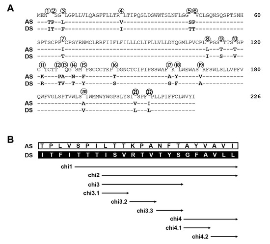 Expression of S protein alone is sufficient to drive SVP secretion in cell culture, although during natural HBV infection the M protein is also incorporated into SVPs. L protein expressed alone is retained inside cells, and its co-expression with S protein can inhibit SVP secretion to variable extents depending on the L/S protein ratio [5,6,7]. Virion formation (envelopment of core particles) is initiated by L protein interaction with the core protein, while virion secretion is driven by the S protein. The M protein is not essential for the secretion of either SVPs or virions [8,9,10]. Secreted SVPs can promote immune tolerance, whereas intracellular envelope proteins are engaged in virion morphogenesis but may also trigger an immune attack. Thus, the balance between SVP secretion and envelope protein retention as defined by the ratio of extracellular HBsAg/intracellular HBsAg is an important biological trait. In a previous study, we compared envelope protein expression and HBsAg secretion between six genotype A clones and seven genotype D clones derived from patient serum samples [11]. Transient transfection of the human hepatoma cell line Huh7 with dimeric HBV DNA construct (capable of genome replication and expression of all viral proteins) revealed a weaker SPII promoter for genotype D, thus diminishing S protein expression and HBsAg secretion. However, the intracellular levels of HBsAg (by ELISA) and S protein (by Western blot) were even lower, leading to higher ratio of extracellular/intracellular HBsAg by genotype D. Further analysis suggested higher secretion efficiency of the S protein of genotype D than genotype A, which was somewhat offset by stronger inhibitory effect of its L protein [11]. In the present study, we employed one clone each of genotype A and genotype D to characterize the impact of the type of HBV construct and amount of plasmid DNA transfected on the efficiency of HBsAg secretion. In addition, chimeric constructs and site-directed mutants of the 0.7 mer S protein expression construct were employed to identify divergent residues in the 226-aa S protein modulating HBsAg secretion.