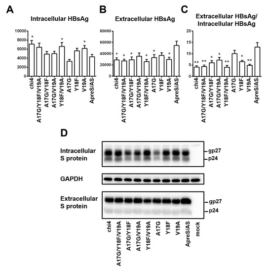Site-directed mutagenesis to identify residues in the S protein that negatively regulate HBsAg secretion from geno1.2. The geno1.2-specific divergent residues 17, 18, 19, or their various combinations were introduced to the 0.7 mer S construct of geno5.4 (ApreS/AS). The parental construct, chi4, and seven site-directed mutants were transfected to Huh7 cells in 6-well plates. (A–C) Total intracellular (A) and extracellular (B) levels of HBsAg (OD450) averaged from three independent transfection experiments, and the calculated ratio of extracellular/intracellular HBsAg (C). Statistical difference between the original construct (ApreS/AS) and a mutant construct was analyzed by one-way ANOVA (* p < 0.05, ** p < 0.01). (D) Western blot analysis of intracellular and extracellular S protein from same volume of cell lysate or culture supernatant. GAPDH served as loading control for intracellular S protein.