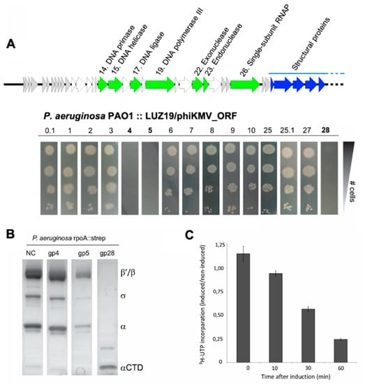 - Klimuk, E.; Akulenko, N.; Makarova, K.S.; Ceyssens, P.J.; Volchenkov, I.; Lavigne, R.; Severinov, K. Host RNA polymerase inhibitors encoded by phiKMV-like phages of Pseudomonas. Virology 2013, 436, 67–74. [Google Scholar] [CrossRef]