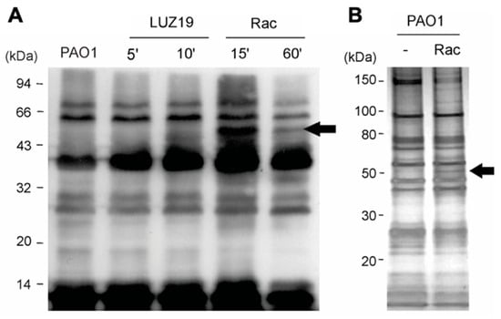 Impact of LUZ19 infection and Rac expression on P. aeruginosa PAO1 acetylation. (A) Variation in the P. aeruginosa acetylome upon infection of LUZ19 and induction of Rac expression. In each lane, 150 µg of cytoplasmic soluble proteins were separated by SDS-PAGE, transferred to a PVDF membrane and subjected to anti-acetyl lysine Western blot. (B) SDS-PAGE gel showing the result of an immunoaffinity enrichment of the Rac substrates from P. aeruginosa cell lysate. The arrow indicates the additional acetylated protein in the presence of recombinant Rac and acetyl-CoA in comparison to the control sample.