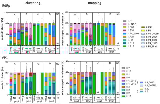 Relative abundance of NoV GII P-types and genotypes identified in the artificial samples. For each nucleic acid pool (A, B, C, D) and dilution (100 and 10 gc/µl), and the negative controls (NC), the proportion of reads assigned to a given genotype is depicted as the mean of the replicates with the standard deviation as error bars, for clustering (left) or mapping (right) analysis of RdRp (top) and VP1 (bottom). The theoretical composition is also depicted for comparison. Colors are matched between RdRp and VP1 graphs according to the NoV strains that were used to generate the samples (example: GII.12[PNA7] = S23 = pink). When unable to differentiate two strains with the same RdRp (P31) or genotype (GII.2, GII.4), both colors were used as stripes. NI: not identified.