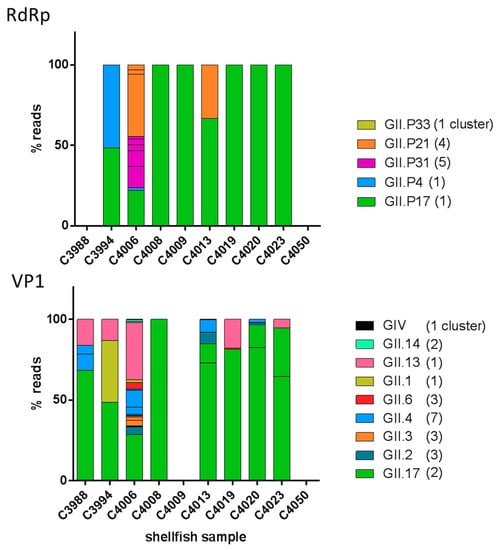 Relative abundance of NoV GII P-types and genotypes identified in the shellfish samples. The proportion of reads belonging to the clusters obtained for RNA-dependent RNA Polymerase (RdRp) (top) and VP1 (bottom) are depicted with the color corresponding to their genotype. The number of clusters obtained per genotype is indicated between parentheses.