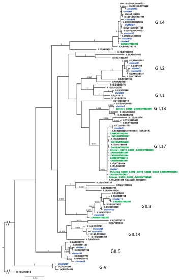 Phylogenetic tree of VP1 clones and clusters from shellfish samples. Bayesian phylogenetic analysis was used to generate this tree with NoV GII, GIII, and GIV sequences retrieved from GenBank (black, with genotype|accession number), sequences of clones (green, with sample name|accession number), and of clusters (blue) obtained from the shellfish samples. Posterior probabilities above 0.95 are indicated just above or below the supported branch. The GIII.1 sequence was used as outgroup to root the tree.