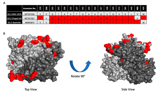 Sequence variation between 2017 GII.2 outbreak strains used in this study and prototype strain GII.2 Snow Mountain Virus (SMV) 1976. (A). Capsid amino acid differences between ancestral GII.2 Snow Mountain Virus (GII.2 SMV 1976) and contemporary 2017 GII.2 strains Chapel Hill and Nashville are shown in red. (B). Residues in contemporary GII.2 that are different from GII.2 SMV 1976 shown in panel A (red) mapped onto the P domain dimer (light and dark grey).