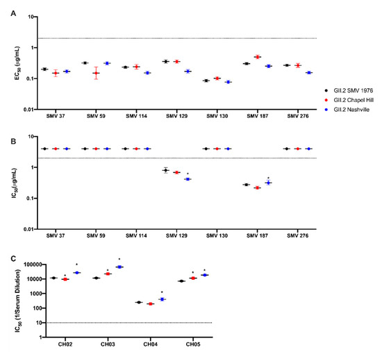 Antibody epitopes are conserved between 2017 GII.2 strains and GII.2 SMV 1976. Contemporary GII.2 Virus Like Particles (VLP) binding to mouse monoclonal antibodies to GII.2 SMV 1976 VLP (Swanstrom et al., 2014). EC50 and IC50 values were calculated for sigmoidal dose-response curves fit to the percent maximum binding for EIA (A), and mean percent control binding for antibody inhibition of ligand binding, blockade assays by mAb (B), or human sera from GII.2 infected donors (C). Error bars represent 95% confidence intervals. Non-blockade mAbs were assigned an IC50 of 4 μg/mL for statistical analysis and are denoted by data markers on the graph above the upper limit of detection (dashed line) for visual comparison. *, VLP with significantly different blockade titer from that of GII.2.SMV 1976 with p < 0.05.