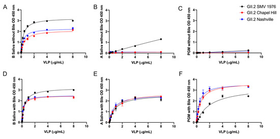 For the bile-titration assay, bovine bile extract, (Sigma-Aldrich, St. Louis, MO, USA) was serially diluted starting at 2% in 1 µg/mL VLP blotto solution onto either A or B saliva coated plates. Bound VLP were detected with anti-VLP rabbit hyperimmune sera, followed by anti-rabbit IgG-HRP, and color developed as above.