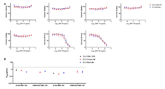 Bile does not affect antibody blockade of Contemporary GII.2 VLP binding to ligands. (A) Contemporary GII.2 VLP blockade of PGM binding by mouse monoclonal antibodies is maintained in the presence of 1% bile. Error bars represent standard error of the mean. (B) IC50 values obtained for SMV 129 and SMV 187 on different ligand sources, with and without bile. Sigmoidal dose–response curves were fit to the mean percent control binding for blockade assays, and the IC50 was calculated in μg/mL. Dashed line represents limit of detection. Error represents 95% confidence intervals.