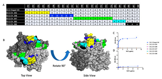 The amino acid sequences of GII.2 1976 SMV (accession no. MT767436), GII.2 Chapel Hill (MT767367), and GII.2 Nashville (ARR95874) were aligned using Geneious Prime version 2019.2.1 (Geneious, San Diego, CA, USA). PDB accession no. 2OBT was used as a template for generation of P domain structural homology models utilizing PyMOL 2.2.0 (Schrodinger, New York City, NY, USA). For GII.2 CH alanine mutant VLPs, sequence changes observed between GII.2 SMV and contemporary GII.2 VLP were parsed into 5 groups and alanine mutations designed in the GII.2 Chapel Hill backbone.