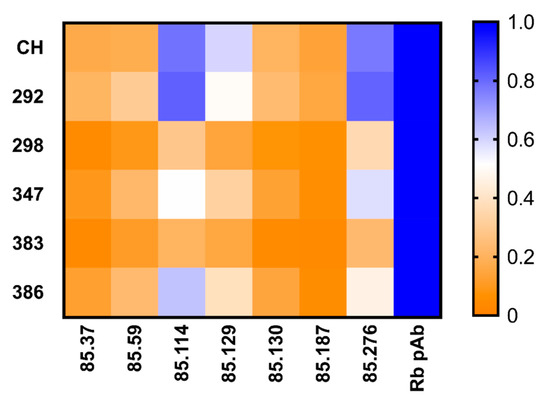 EIAs were performed as described [44]. EIA plates were coated with VLP (0.25 g/mL) in PBS for 4 h and blocked over night at 4 °C in 5% non-fat dried milk in PBS-0.05% Tween-20 (blotto) before addition of decreasing two-fold serial dilutions of mouse mAb or rabbit pAb. All antibody incubations were conducted at 37 °C in blotto. Bound antibody was detected by either anti-mouse IgG-HRP or anti-rabbit IgG-HRP (GE Healthcare, Chicago, IL, USA), and color developed with 1-Step Ultra TMB ELISA HRP substrate solution (Thermo-Fisher, Waltham, MA, USA). Fifty percent effective concentration (EC50) was determined for antibodies with optical densities (ODs) ≥ 3× background at 2 µg/mL. Data were fit using sigmoidal dose–response analysis of nonlinear data in GraphPad Prism 8.3.0 (GraphPad Software, La Jolla, CA, USA). Monoclonal Abs below the limit of detection were assigned an EC50 of 2× the assay upper limit of detection for statistical comparison.