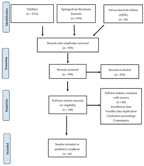 During the literature search, PubMed yielded 1313 records, SpringerLink electronic journals had 293 and AJOL showed 50 records, giving a total of 1656 research records. Of the 1656 research records, 678 (40.9%) were duplicates and were discarded. Using the set inclusion and exclusion criteria, we screened the remaining 978 records following a flow chart (Figure 1). During the screening, 870/978 (89.0%) articles were excluded based on their titles and abstracts, while 108 articles were retained. The 108 full-text articles were further screened for eligibility and 40/108 (37.0%) were excluded, while a total of 68/108 (63.0%) articles were deemed eligible for inclusion in this systematic review. Table S1 is provided as a Supplemental Material of all included studies.